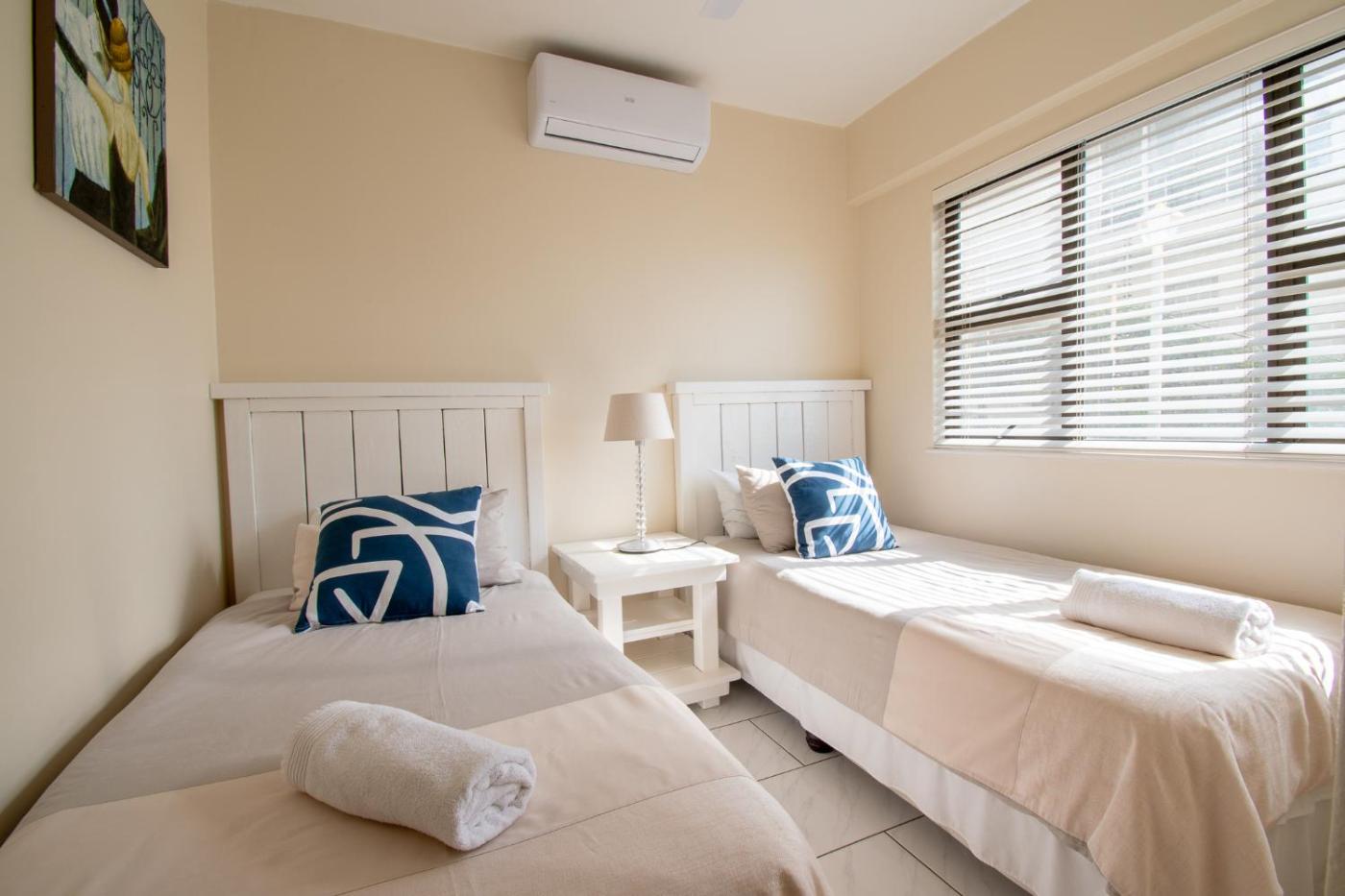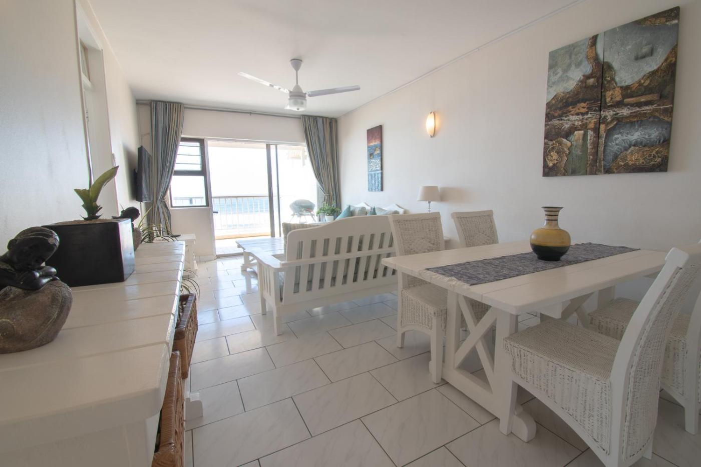 Two-Bedroom Apartment. The sea-views from this apartment are superb. The popular promenade, the sand and surf areright in front of you. The open plan kitchen, dining room and lounge lead onto the large balconyyou can sit and just enjoy relaxing. The main bedroom also opens onto the balcony so it feels as if the sea isaround you. The en-suite has a bath and toilet and the 2nd bedroom shares the guest shower and toilet. The apartment is air-conditioned, has full DSTV and free Wi-Fi.