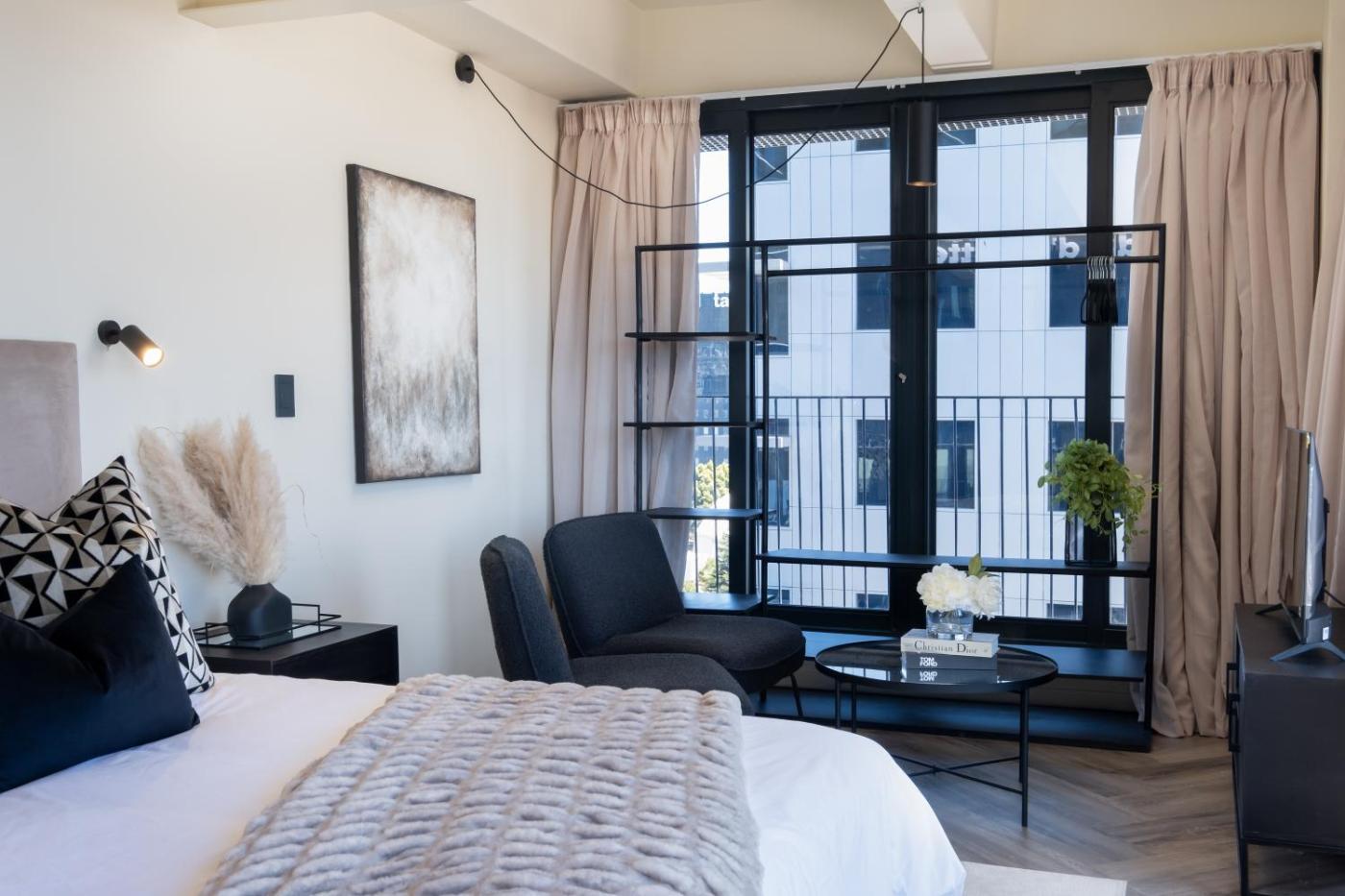 Deluxe One-Bedroom Apartment. The apartment has 1 bedroom and 1 bathroom with a shower and free toiletries. In the kitchenette, guests will find a stovetop, a refrigerator, kitchenware and a microwave. The apartment offers a tea and coffee maker, a seating area, a wardrobe, a flat-screen TV, as well as city views. The unit has 1 bed. ;