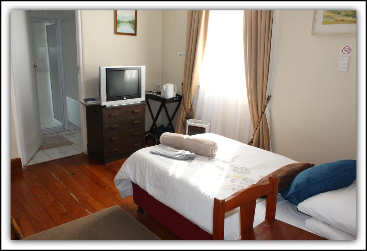 Single Room. Knysna Manor House has 2 single rooms, each uniquely decorated. Room 1 is located inside the main house, next to the reception. It features an en suite bathroom with a bath and a shower and is equipped with a ¾ bed. Room 5 is separate from the main house and features a kitchenette equipped with a fridge and a microwave. The bathroom has a shower. ;
